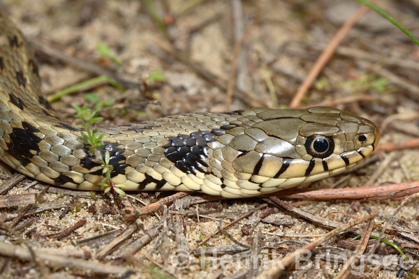 the common grass snake is a nonvenomous colubroid that lives near ponds, lakes, canals, and ditches. it is usually 0.6 to 1 meters long, (2 to 3.3 feet) although they can grow to be up to 2 meters long. they are great swimmers, and they live in Europe and west Asia. it has keeled scales and a triangular head. they are oviparous, and lay 8 to 40 eggs.